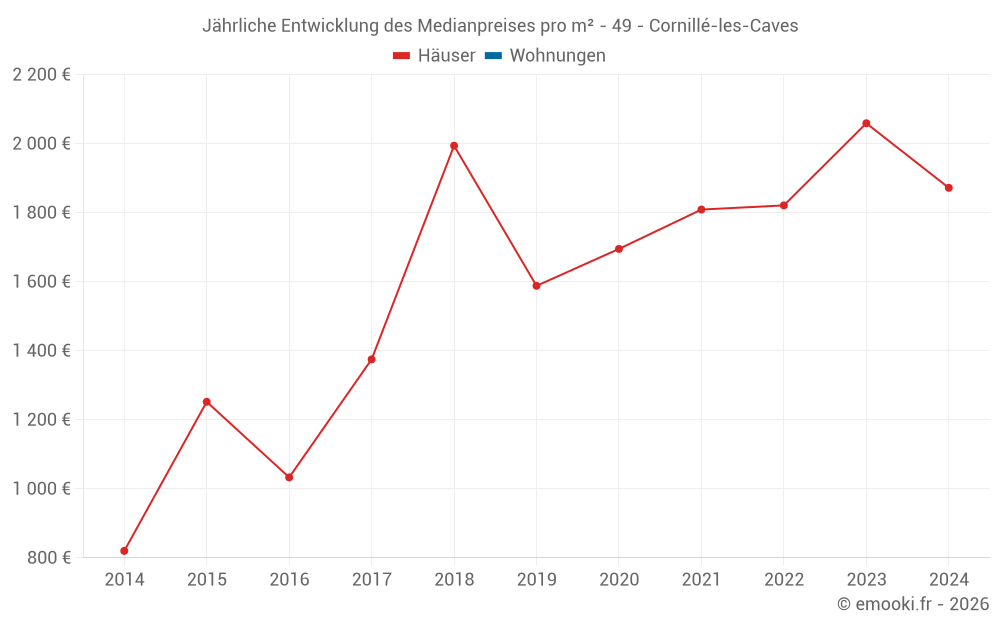 Der Durchschnittspreis auf den 16 Hausgeschäften der letzten 24 Monate in der Gemeinde Cornillé-les-Caves betrug 1 930 € pro Quadratmeter für einen mittleren Immobilienwert von 242 750 €. Über diesen Zeitraum hinweg lagen 60% der Transaktionen zwischen 1 782 und 2 536 € pro Quadratmeter (vom 2. bis zum 8. Dezil).