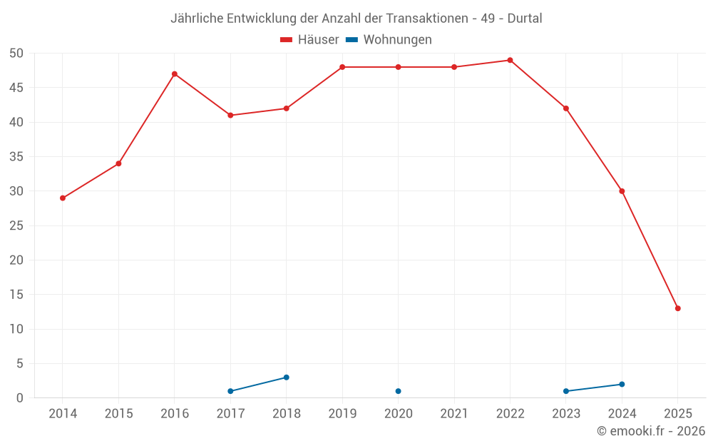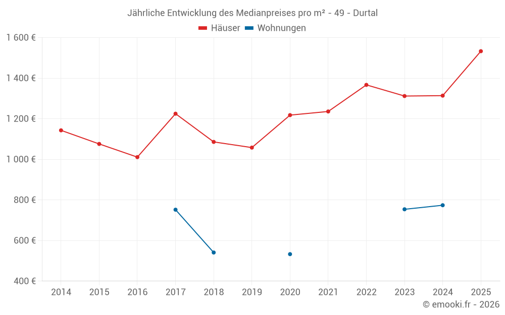 Der Durchschnittspreis auf den 33 Hausgeschäften der letzten 12 Monate in der Gemeinde Durtal betrug 1 435 € pro Quadratmeter für einen mittleren Immobilienwert von 138 000 €. Über diesen Zeitraum hinweg lagen 60% der Transaktionen zwischen 1 044 und 1 733 € pro Quadratmeter (vom 2. bis zum 8. Dezil).