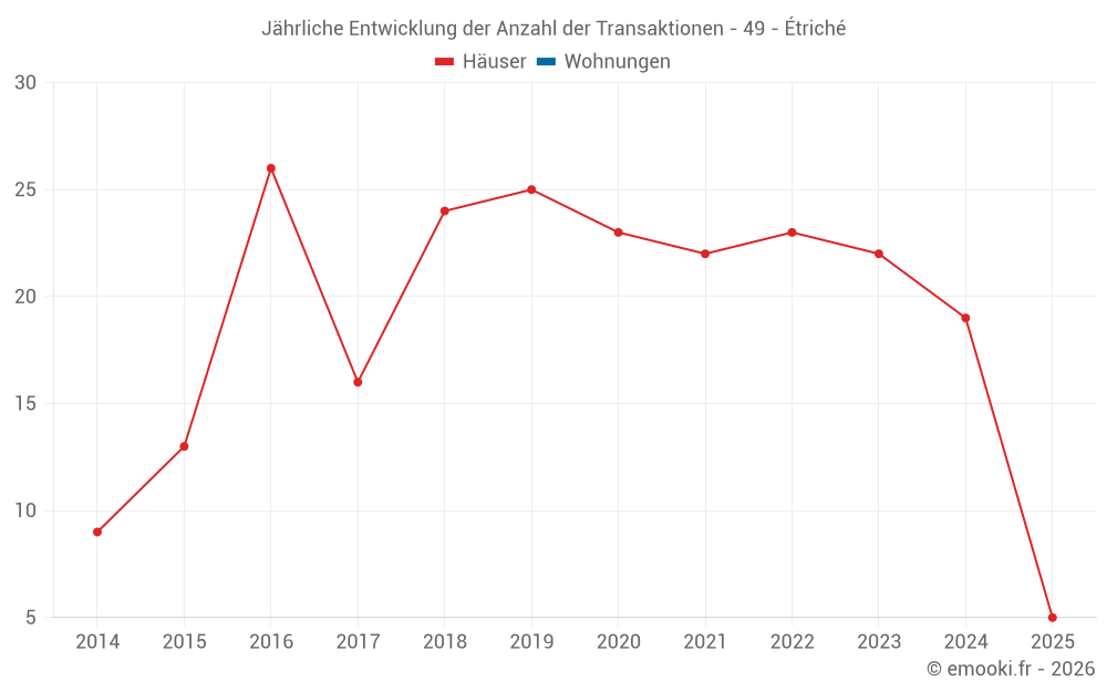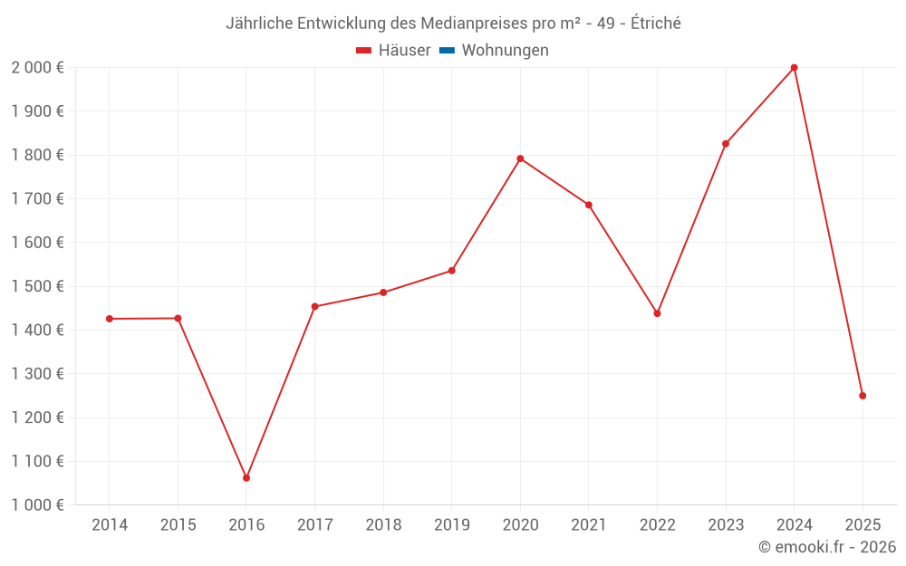 Der Durchschnittspreis auf den 16 Hausgeschäften der letzten 12 Monate in der Gemeinde Étriché betrug 1 689 € pro Quadratmeter für einen mittleren Immobilienwert von 180 500 €. Über diesen Zeitraum hinweg lagen 60% der Transaktionen zwischen 1 000 und 2 083 € pro Quadratmeter (vom 2. bis zum 8. Dezil).