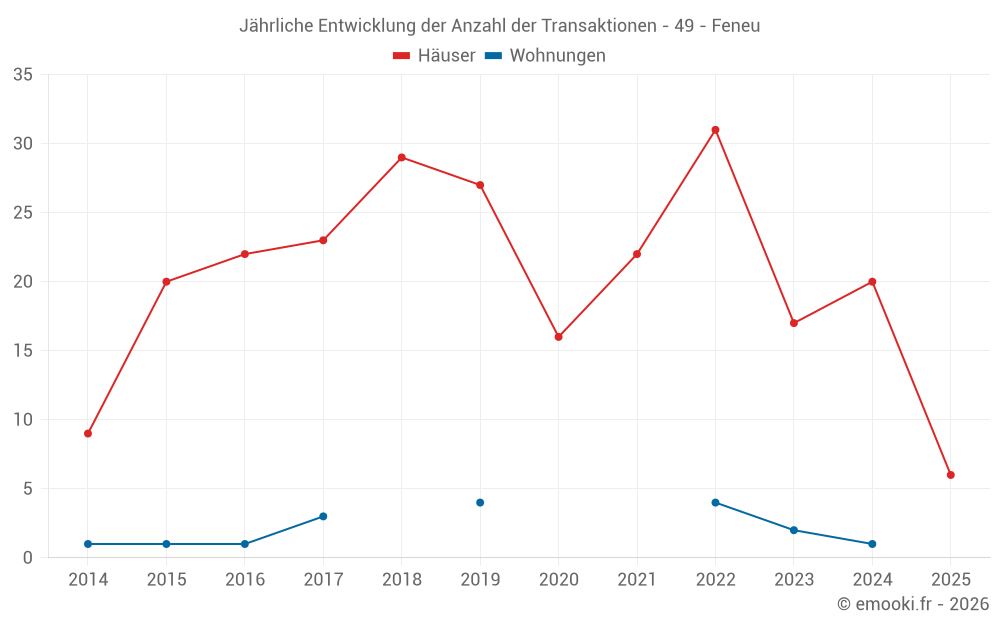 Der Durchschnittspreis auf den 16 Hausgeschäften der letzten 12 Monate in der Gemeinde Feneu betrug 2 196 € pro Quadratmeter für einen mittleren Immobilienwert von 207 750 €. Über diesen Zeitraum hinweg lagen 60% der Transaktionen zwischen 1 600 und 2 680 € pro Quadratmeter (vom 2. bis zum 8. Dezil).