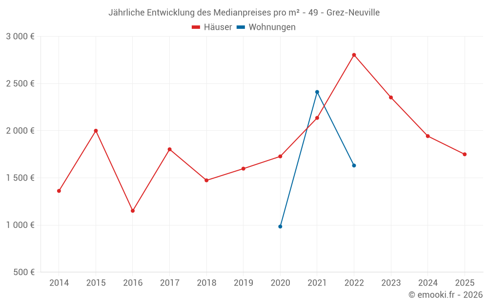 Der Durchschnittspreis auf den 16 Hausgeschäften der letzten 24 Monate in der Gemeinde Grez-Neuville betrug 2 239 € pro Quadratmeter für einen mittleren Immobilienwert von 308 750 €. Über diesen Zeitraum hinweg lagen 60% der Transaktionen zwischen 1 609 und 2 667 € pro Quadratmeter (vom 2. bis zum 8. Dezil).