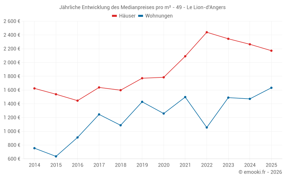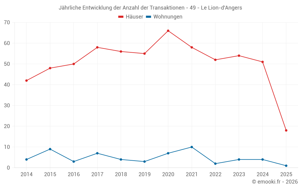 Der Durchschnittspreis auf den 18 Hausgeschäften der letzten 6 Monate in der Gemeinde Le Lion-d'Angers betrug 2 172 € pro Quadratmeter für einen mittleren Immobilienwert von 195 000 €. Über diesen Zeitraum hinweg lagen 60% der Transaktionen zwischen 1 733 und 2 606 € pro Quadratmeter (vom 2. bis zum 8. Dezil).