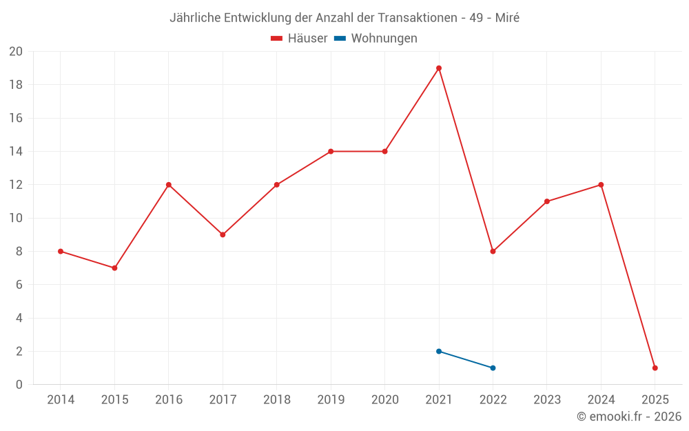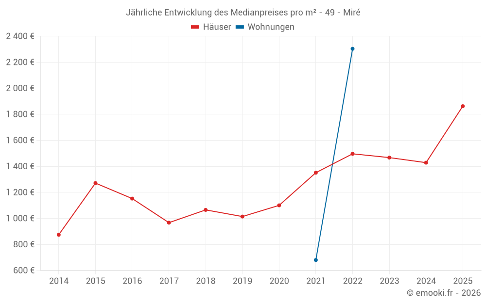 Der Durchschnittspreis auf den 19 Hausgeschäften der letzten 24 Monate in der Gemeinde Miré betrug 1 543 € pro Quadratmeter für einen mittleren Immobilienwert von 133 000 €. Über diesen Zeitraum hinweg lagen 60% der Transaktionen zwischen 1 137 und 1 892 € pro Quadratmeter (vom 2. bis zum 8. Dezil).