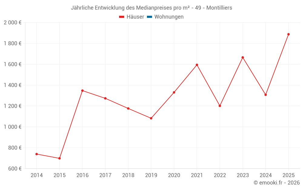 Der Durchschnittspreis auf den 18 Hausgeschäften der letzten 24 Monate in der Gemeinde Montilliers betrug 1 432 € pro Quadratmeter für einen mittleren Immobilienwert von 155 000 €. Über diesen Zeitraum hinweg lagen 60% der Transaktionen zwischen 877 und 1 960 € pro Quadratmeter (vom 2. bis zum 8. Dezil).