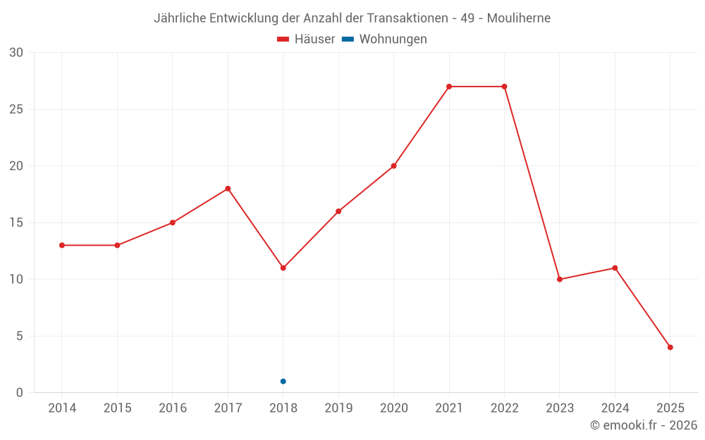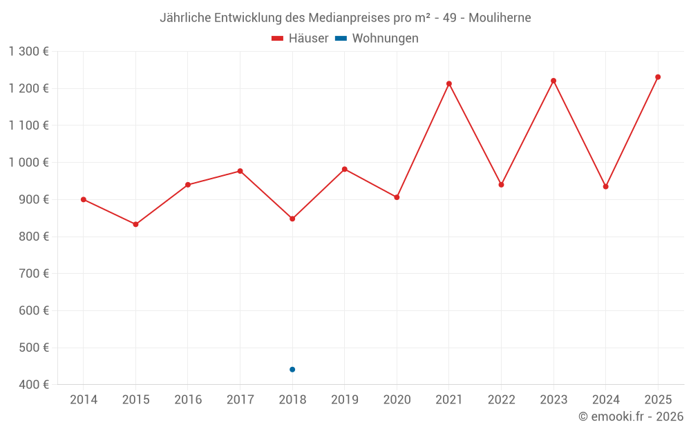 Der Durchschnittspreis auf den 21 Hausgeschäften der letzten 24 Monate in der Gemeinde Mouliherne betrug 1 035 € pro Quadratmeter für einen mittleren Immobilienwert von 93 000 €. Über diesen Zeitraum hinweg lagen 60% der Transaktionen zwischen 800 und 1 427 € pro Quadratmeter (vom 2. bis zum 8. Dezil).