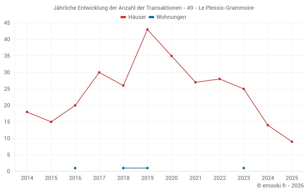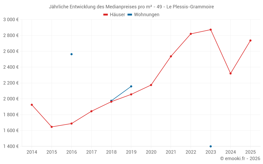 Der Durchschnittspreis auf den 20 Hausgeschäften der letzten 12 Monate in der Gemeinde Le Plessis-Grammoire betrug 2 394 € pro Quadratmeter für einen mittleren Immobilienwert von 299 970 €. Über diesen Zeitraum hinweg lagen 60% der Transaktionen zwischen 2 005 und 2 896 € pro Quadratmeter (vom 2. bis zum 8. Dezil).