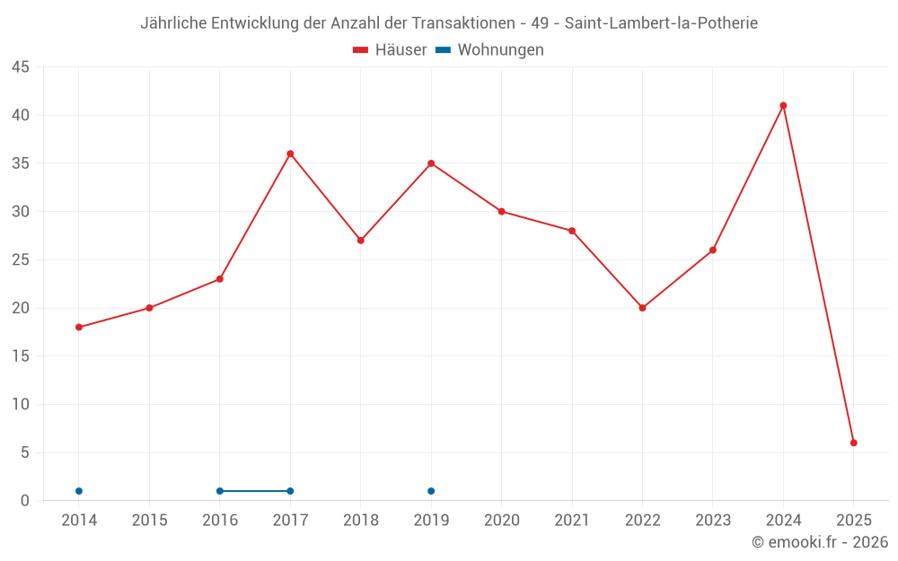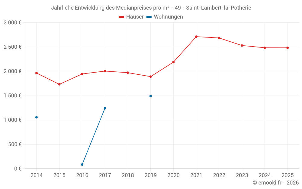Der Durchschnittspreis auf den 21 Hausgeschäften der letzten 12 Monate in der Gemeinde Saint-Lambert-la-Potherie betrug 2 307 € pro Quadratmeter für einen mittleren Immobilienwert von 254 800 €. Über diesen Zeitraum hinweg lagen 60% der Transaktionen zwischen 1 869 und 2 824 € pro Quadratmeter (vom 2. bis zum 8. Dezil).