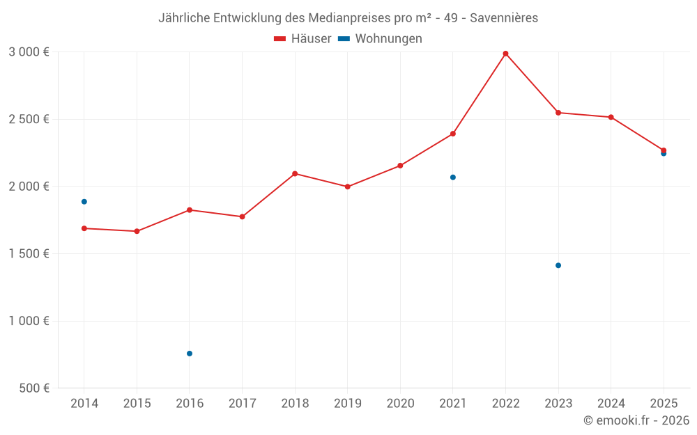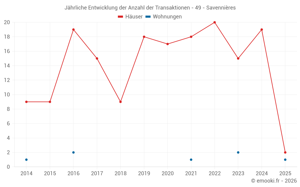 Der Durchschnittspreis auf den 26 Hausgeschäften der letzten 24 Monate in der Gemeinde Savennières betrug 2 491 € pro Quadratmeter für einen mittleren Immobilienwert von 234 500 €. Über diesen Zeitraum hinweg lagen 60% der Transaktionen zwischen 1 914 und 3 019 € pro Quadratmeter (vom 2. bis zum 8. Dezil).