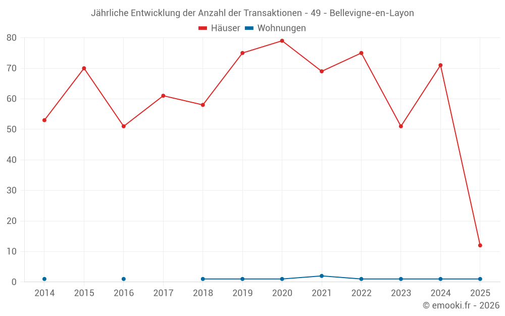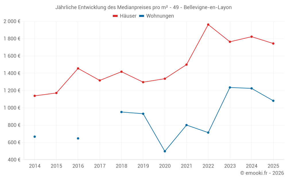 Der Durchschnittspreis auf den 54 Hausgeschäften der letzten 12 Monate in der Gemeinde Bellevigne-en-Layon betrug 1 786 € pro Quadratmeter für einen mittleren Immobilienwert von 158 500 €. Über diesen Zeitraum hinweg lagen 60% der Transaktionen zwischen 1 072 und 2 260 € pro Quadratmeter (vom 2. bis zum 8. Dezil).