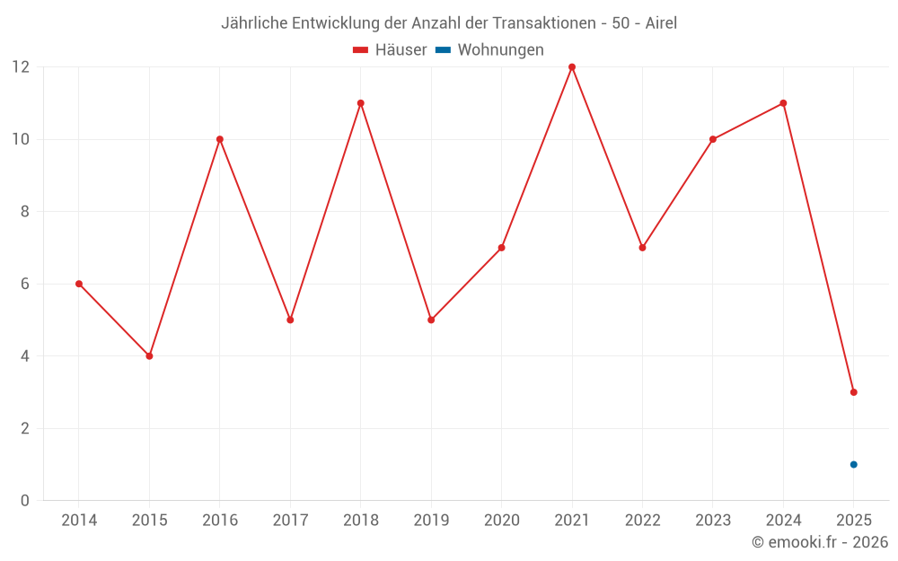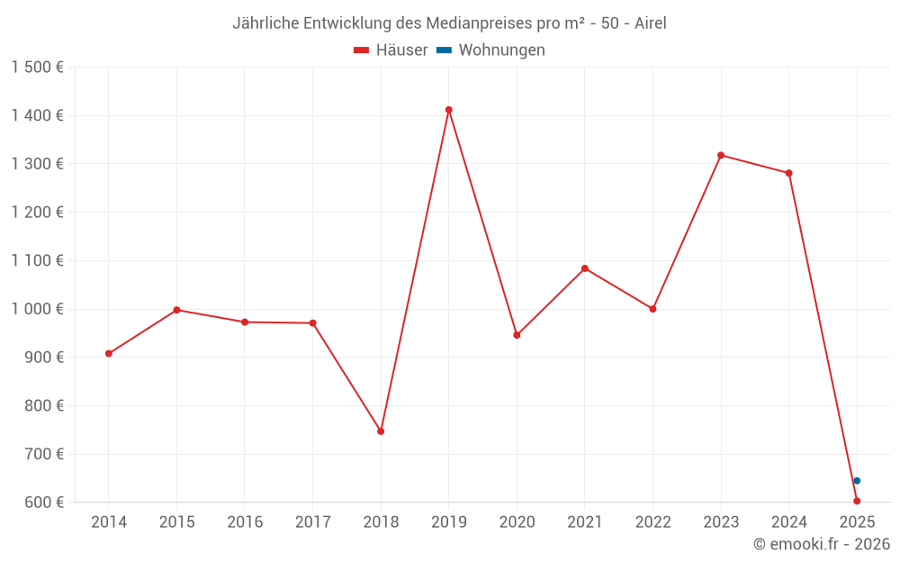 Der Durchschnittspreis auf den 20 Hausgeschäften der letzten 24 Monate in der Gemeinde Airel betrug 1 235 € pro Quadratmeter für einen mittleren Immobilienwert von 111 438 €. Über diesen Zeitraum hinweg lagen 60% der Transaktionen zwischen 613 und 1 691 € pro Quadratmeter (vom 2. bis zum 8. Dezil).
