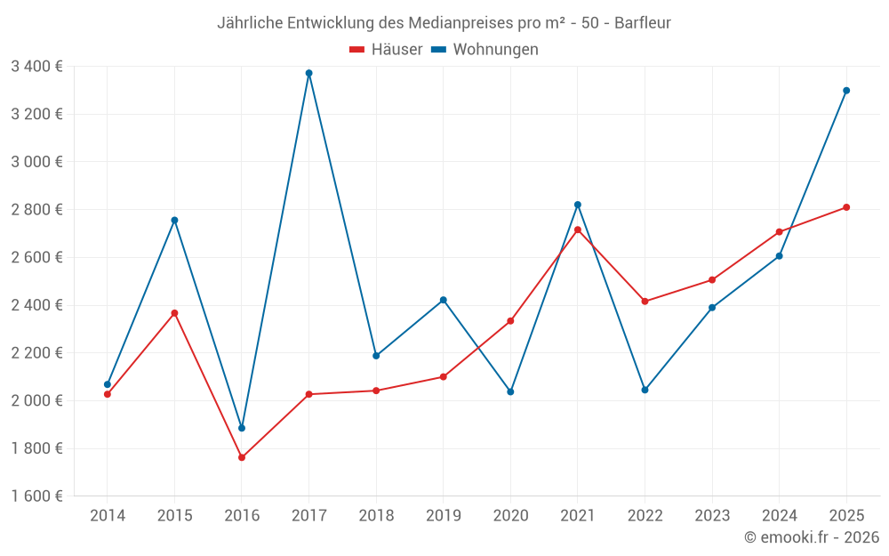 Der Durchschnittspreis auf den 15 Wohnungstransaktionen der letzten 24 Monate in der Gemeinde Barfleur betrug 2 623 € pro Quadratmeter für einen mittleren Immobilienwert von 158 000 €. Über diesen Zeitraum hinweg lagen 60% der Transaktionen zwischen 2 092 und 3 809 € pro Quadratmeter (vom 2. bis zum 8. Dezil).