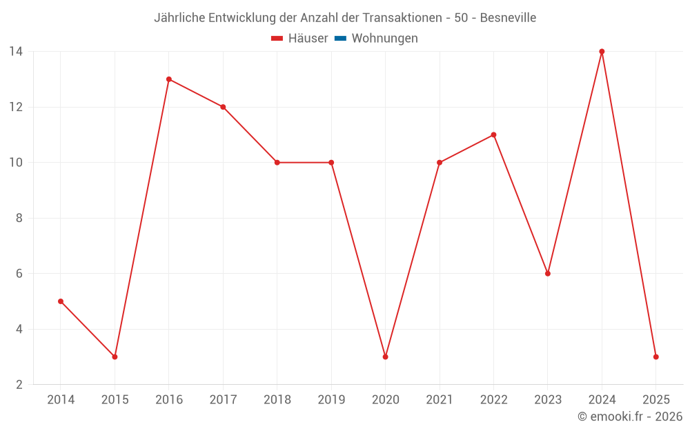 Der Durchschnittspreis auf den 22 Hausgeschäften der letzten 24 Monate in der Gemeinde Besneville betrug 1 547 € pro Quadratmeter für einen mittleren Immobilienwert von 151 000 €. Über diesen Zeitraum hinweg lagen 60% der Transaktionen zwischen 1 043 und 2 044 € pro Quadratmeter (vom 2. bis zum 8. Dezil).