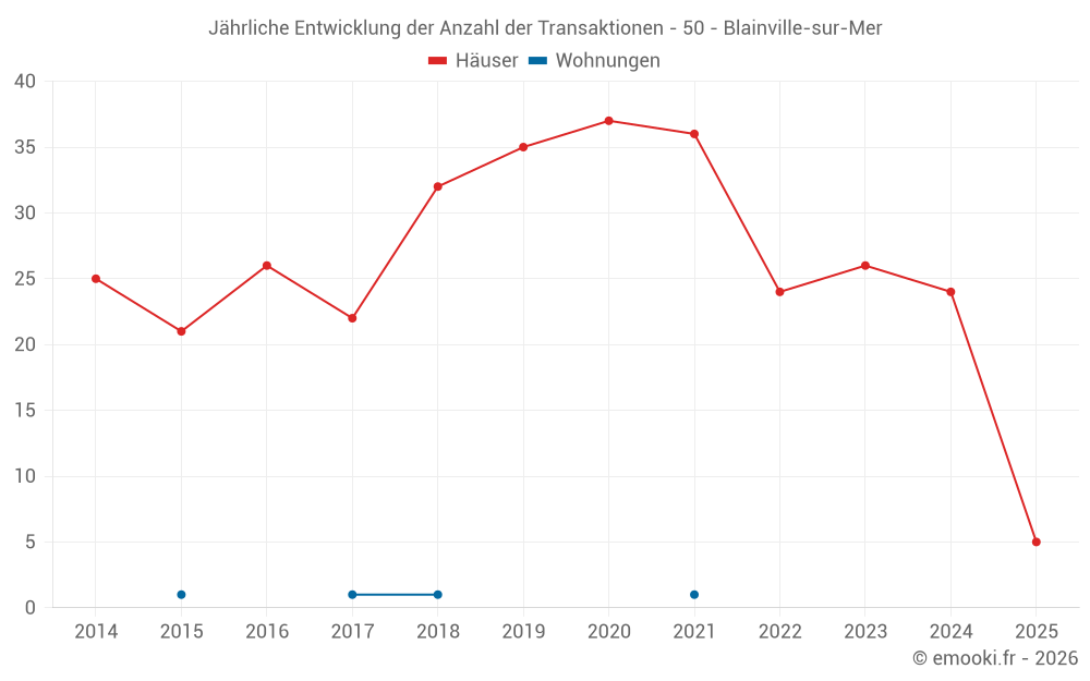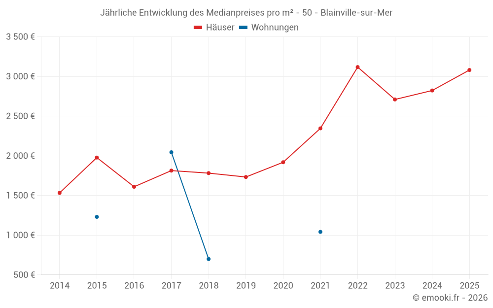 Der Durchschnittspreis auf den 18 Hausgeschäften der letzten 12 Monate in der Gemeinde Blainville-sur-Mer betrug 2 868 € pro Quadratmeter für einen mittleren Immobilienwert von 210 000 €. Über diesen Zeitraum hinweg lagen 60% der Transaktionen zwischen 1 639 und 3 436 € pro Quadratmeter (vom 2. bis zum 8. Dezil).