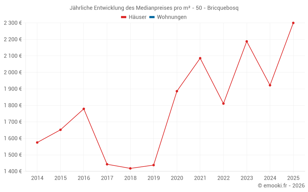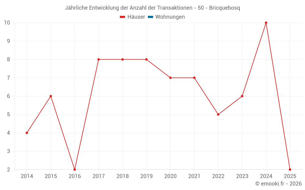 Der Durchschnittspreis auf den 14 Hausgeschäften der letzten 24 Monate in der Gemeinde Bricquebosq betrug 2 188 € pro Quadratmeter für einen mittleren Immobilienwert von 197 285 €. Über diesen Zeitraum hinweg lagen 60% der Transaktionen zwischen 1 616 und 2 665 € pro Quadratmeter (vom 2. bis zum 8. Dezil).