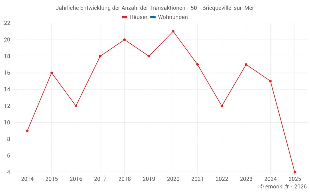 Der Durchschnittspreis auf den 31 Hausgeschäften der letzten 24 Monate in der Gemeinde Bricqueville-sur-Mer betrug 2 191 € pro Quadratmeter für einen mittleren Immobilienwert von 192 600 €. Über diesen Zeitraum hinweg lagen 60% der Transaktionen zwischen 857 und 3 083 € pro Quadratmeter (vom 2. bis zum 8. Dezil).