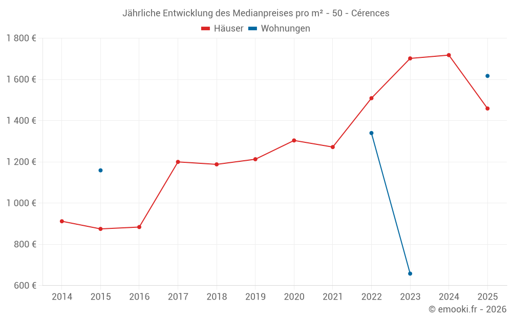 Der Durchschnittspreis auf den 30 Hausgeschäften der letzten 12 Monate in der Gemeinde Cérences betrug 1 639 € pro Quadratmeter für einen mittleren Immobilienwert von 153 000 €. Über diesen Zeitraum hinweg lagen 60% der Transaktionen zwischen 997 und 2 123 € pro Quadratmeter (vom 2. bis zum 8. Dezil).