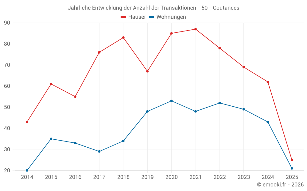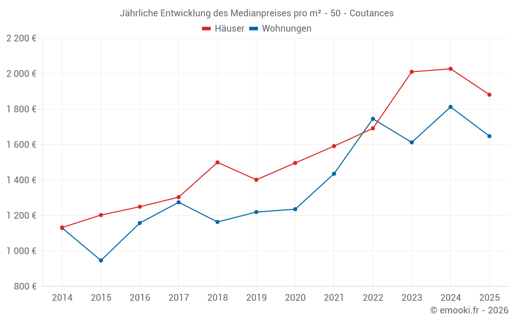 Der Durchschnittspreis auf den 25 Hausgeschäften der letzten 6 Monate in der Gemeinde Coutances betrug 1 882 € pro Quadratmeter für einen mittleren Immobilienwert von 192 600 €. Über diesen Zeitraum hinweg lagen 60% der Transaktionen zwischen 1 401 und 2 651 € pro Quadratmeter (vom 2. bis zum 8. Dezil).