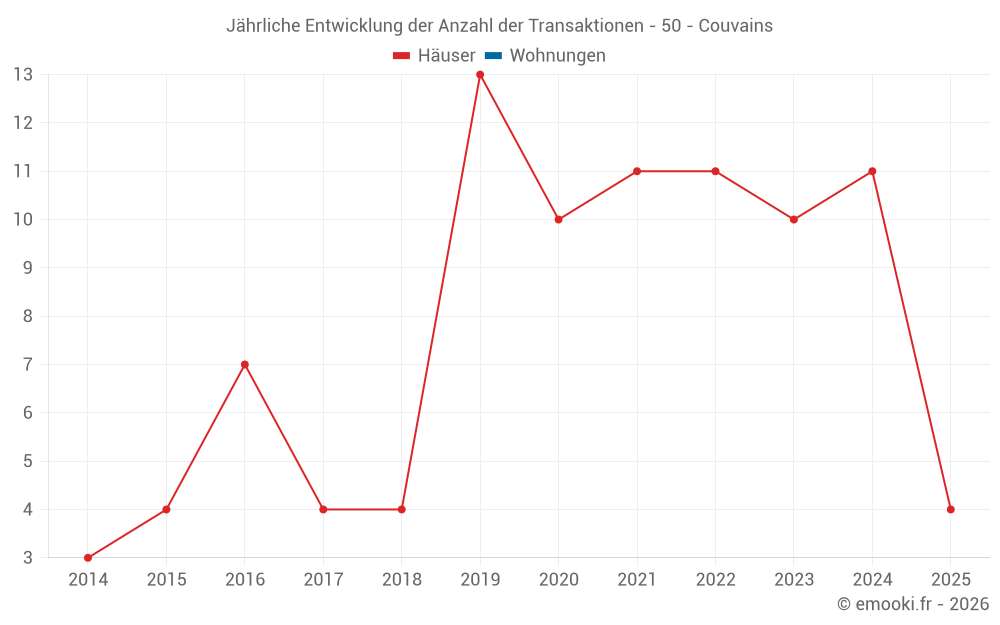 Der Durchschnittspreis auf den 19 Hausgeschäften der letzten 24 Monate in der Gemeinde Couvains betrug 1 270 € pro Quadratmeter für einen mittleren Immobilienwert von 98 000 €. Über diesen Zeitraum hinweg lagen 60% der Transaktionen zwischen 682 und 1 713 € pro Quadratmeter (vom 2. bis zum 8. Dezil).