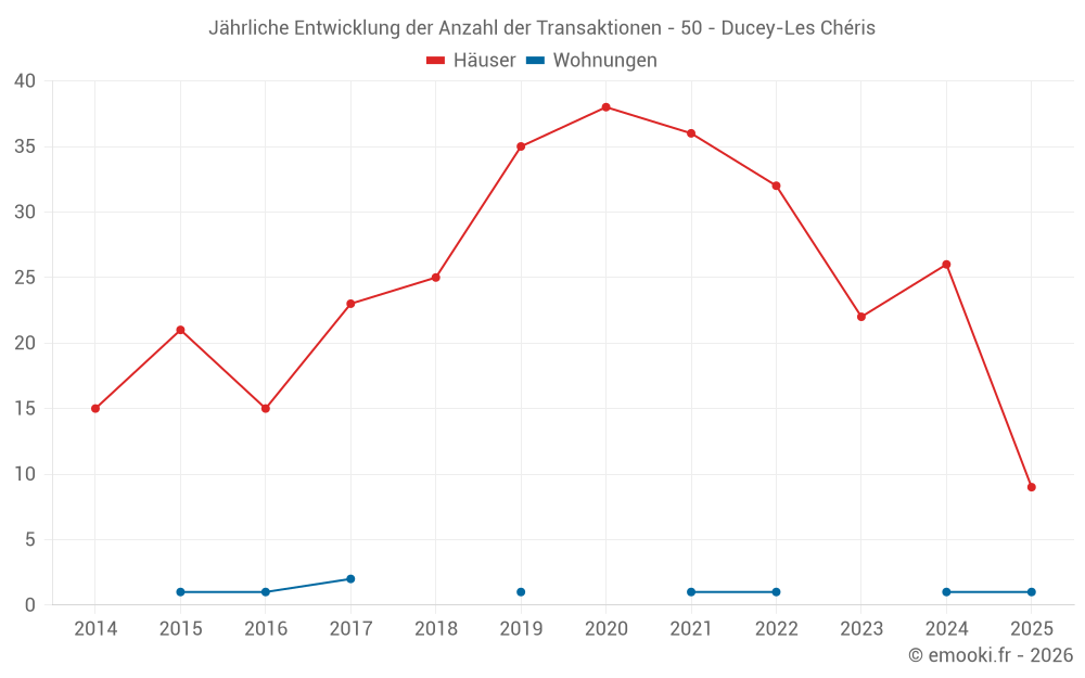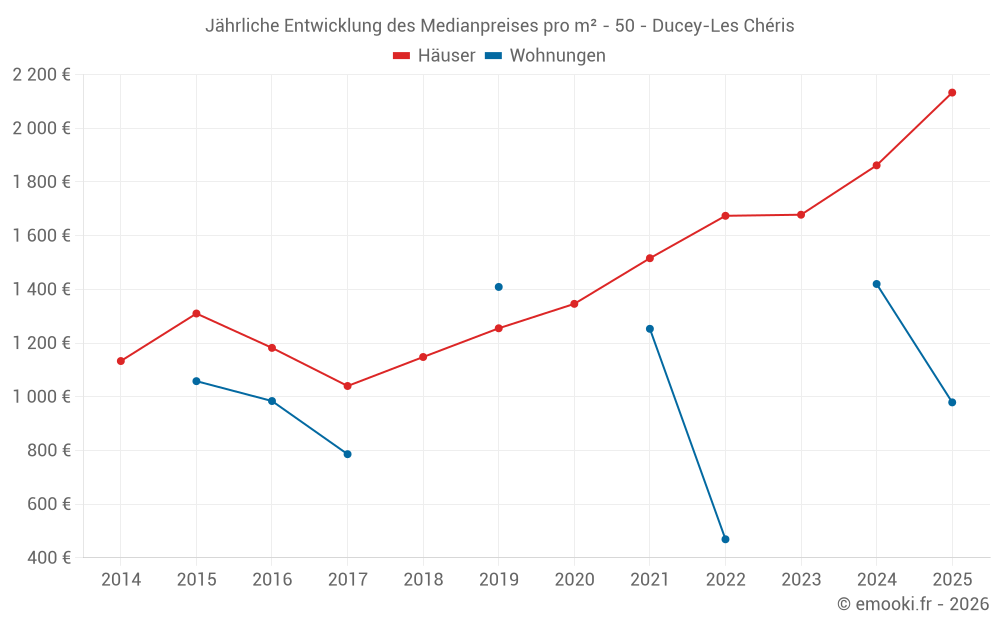 Der Durchschnittspreis auf den 24 Hausgeschäften der letzten 12 Monate in der Gemeinde Ducey-Les Chéris betrug 2 137 € pro Quadratmeter für einen mittleren Immobilienwert von 179 000 €. Über diesen Zeitraum hinweg lagen 60% der Transaktionen zwischen 1 449 und 2 535 € pro Quadratmeter (vom 2. bis zum 8. Dezil).