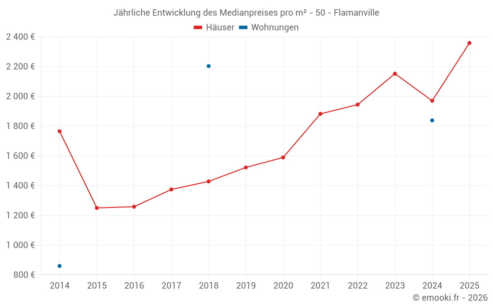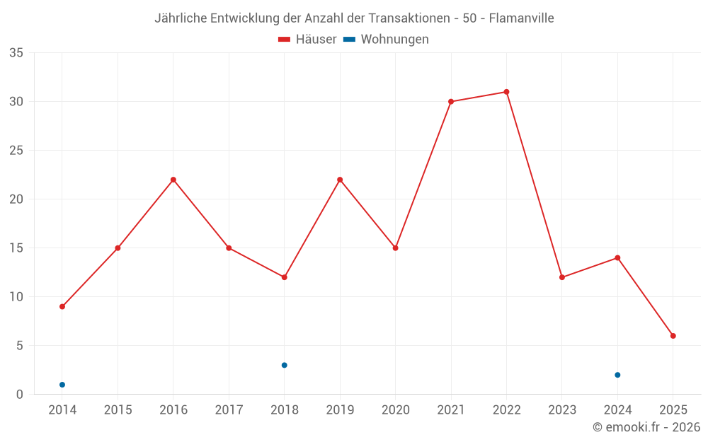 Der Durchschnittspreis auf den 26 Hausgeschäften der letzten 24 Monate in der Gemeinde Flamanville betrug 2 115 € pro Quadratmeter für einen mittleren Immobilienwert von 181 739 €. Über diesen Zeitraum hinweg lagen 60% der Transaktionen zwischen 1 727 und 2 870 € pro Quadratmeter (vom 2. bis zum 8. Dezil).