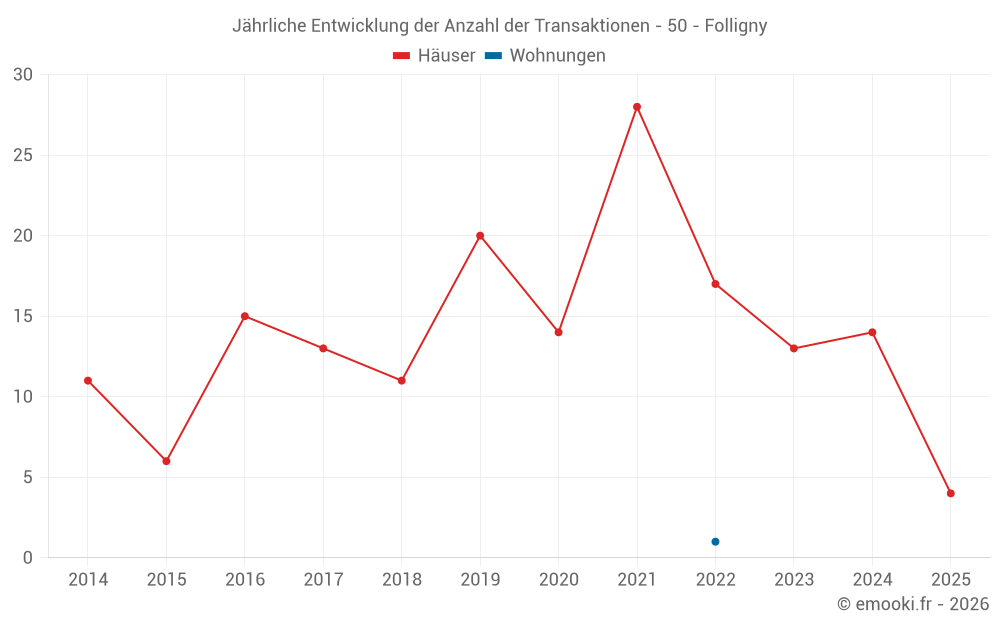 Der Durchschnittspreis auf den 23 Hausgeschäften der letzten 24 Monate in der Gemeinde Folligny betrug 1 346 € pro Quadratmeter für einen mittleren Immobilienwert von 140 000 €. Über diesen Zeitraum hinweg lagen 60% der Transaktionen zwischen 948 und 2 326 € pro Quadratmeter (vom 2. bis zum 8. Dezil).