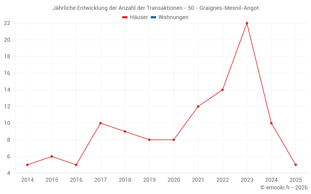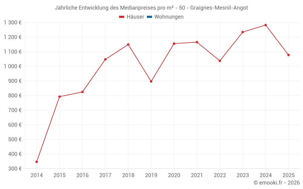 Der Durchschnittspreis auf den 27 Hausgeschäften der letzten 24 Monate in der Gemeinde Graignes-Mesnil-Angot betrug 1 288 € pro Quadratmeter für einen mittleren Immobilienwert von 156 000 €. Über diesen Zeitraum hinweg lagen 60% der Transaktionen zwischen 557 und 1 558 € pro Quadratmeter (vom 2. bis zum 8. Dezil).