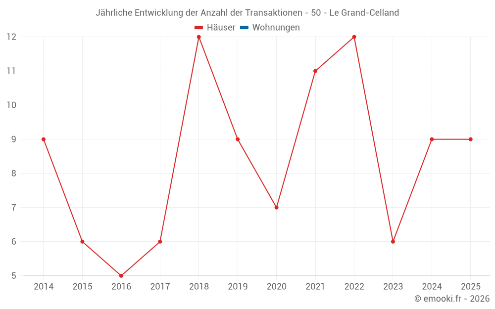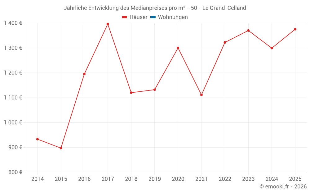 Der Durchschnittspreis auf den 20 Hausgeschäften der letzten 24 Monate in der Gemeinde Le Grand-Celland betrug 1 337 € pro Quadratmeter für einen mittleren Immobilienwert von 96 885 €. Über diesen Zeitraum hinweg lagen 60% der Transaktionen zwischen 769 und 1 991 € pro Quadratmeter (vom 2. bis zum 8. Dezil).