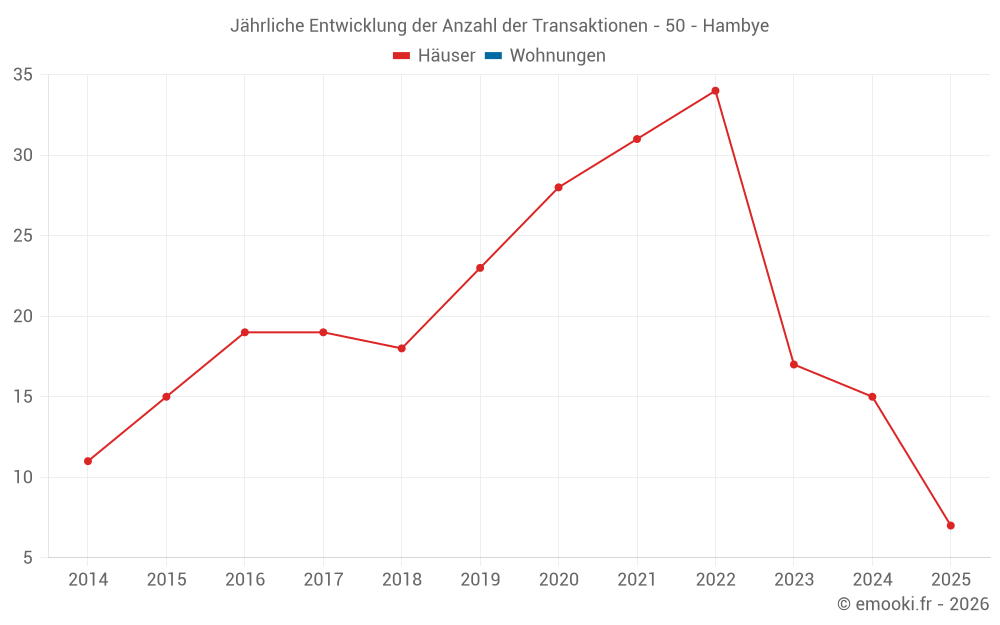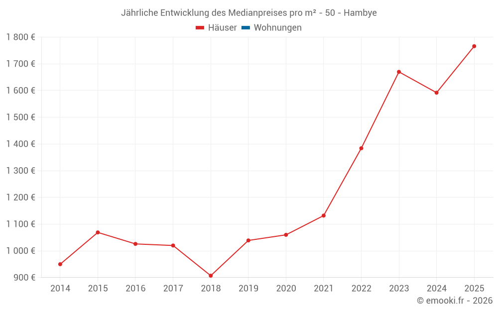 Der Durchschnittspreis auf den 16 Hausgeschäften der letzten 12 Monate in der Gemeinde Hambye betrug 1 718 € pro Quadratmeter für einen mittleren Immobilienwert von 152 500 €. Über diesen Zeitraum hinweg lagen 60% der Transaktionen zwischen 1 193 und 2 404 € pro Quadratmeter (vom 2. bis zum 8. Dezil).