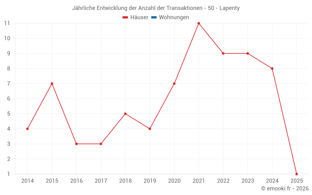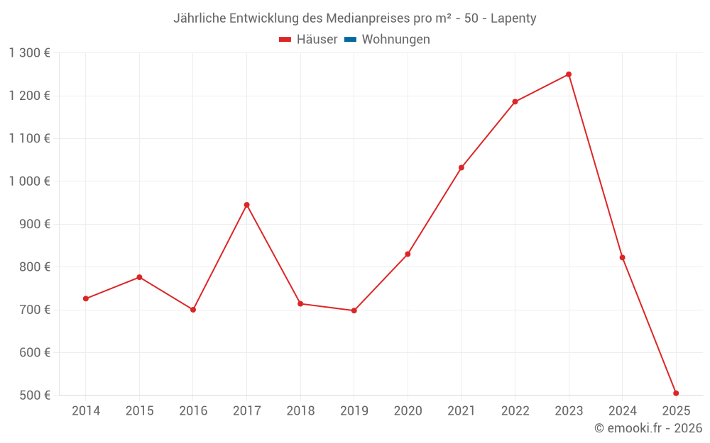 Der Durchschnittspreis auf den 14 Hausgeschäften der letzten 24 Monate in der Gemeinde Lapenty betrug 1 219 € pro Quadratmeter für einen mittleren Immobilienwert von 85 000 €. Über diesen Zeitraum hinweg lagen 60% der Transaktionen zwischen 654 und 1 535 € pro Quadratmeter (vom 2. bis zum 8. Dezil).