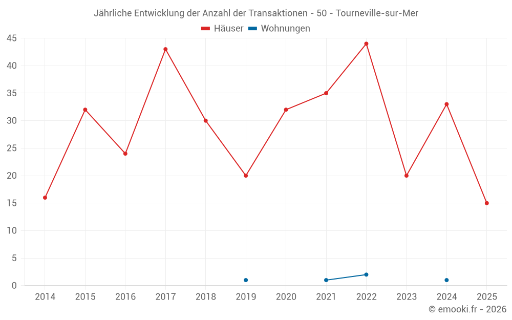 Der Durchschnittspreis auf den 36 Hausgeschäften der letzten 12 Monate in der Gemeinde Tourneville-sur-Mer betrug 2 064 € pro Quadratmeter für einen mittleren Immobilienwert von 189 144 €. Über diesen Zeitraum hinweg lagen 60% der Transaktionen zwischen 1 616 und 2 836 € pro Quadratmeter (vom 2. bis zum 8. Dezil).