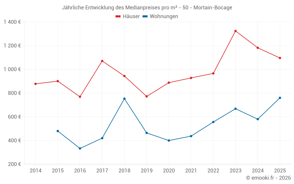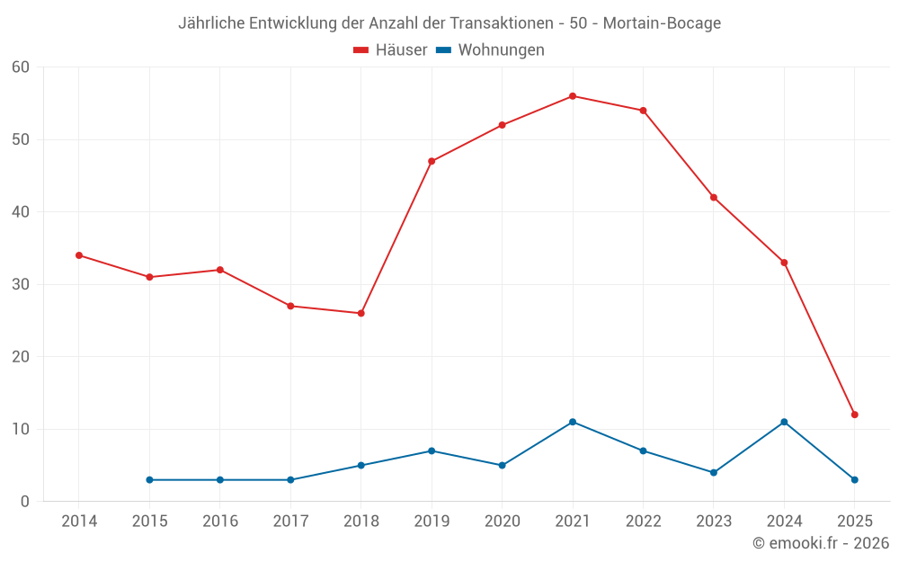 Der Durchschnittspreis auf den 23 Hausgeschäften der letzten 12 Monate in der Gemeinde Mortain-Bocage betrug 1 108 € pro Quadratmeter für einen mittleren Immobilienwert von 92 000 €. Über diesen Zeitraum hinweg lagen 60% der Transaktionen zwischen 678 und 1 407 € pro Quadratmeter (vom 2. bis zum 8. Dezil).