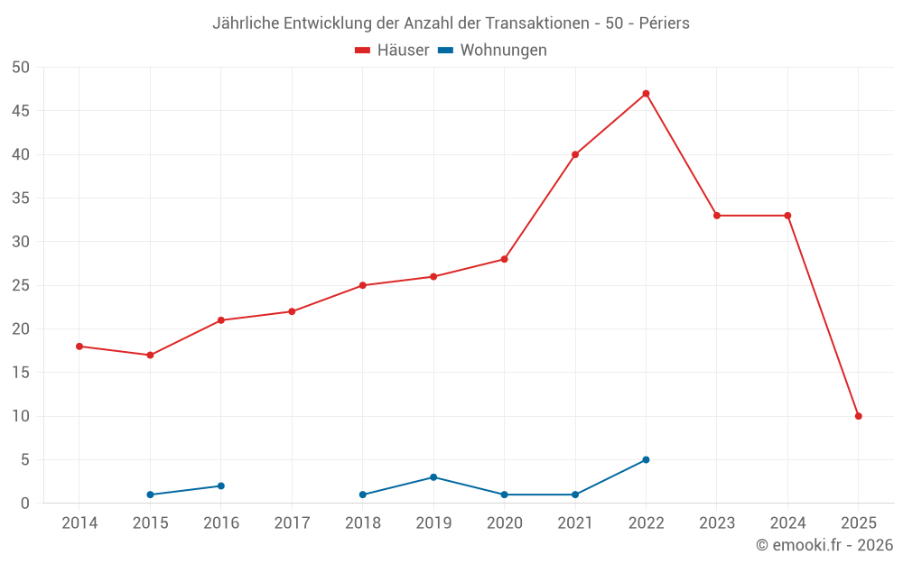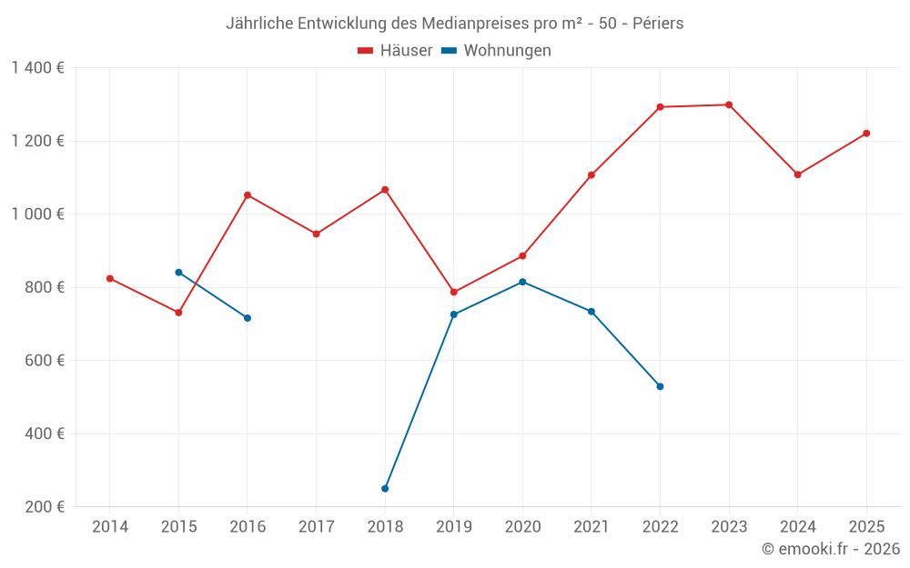 Der Durchschnittspreis auf den 20 Hausgeschäften der letzten 12 Monate in der Gemeinde Périers betrug 1 162 € pro Quadratmeter für einen mittleren Immobilienwert von 92 000 €. Über diesen Zeitraum hinweg lagen 60% der Transaktionen zwischen 606 und 2 022 € pro Quadratmeter (vom 2. bis zum 8. Dezil).