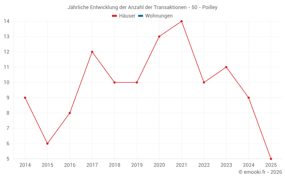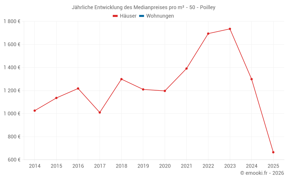 Der Durchschnittspreis auf den 22 Hausgeschäften der letzten 24 Monate in der Gemeinde Poilley betrug 1 584 € pro Quadratmeter für einen mittleren Immobilienwert von 153 500 €. Über diesen Zeitraum hinweg lagen 60% der Transaktionen zwischen 533 und 2 261 € pro Quadratmeter (vom 2. bis zum 8. Dezil).