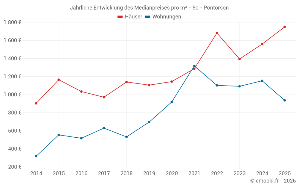 Der Durchschnittspreis auf den 21 Wohnungstransaktionen der letzten 24 Monate in der Gemeinde Pontorson betrug 1 153 € pro Quadratmeter für einen mittleren Immobilienwert von 75 000 €. Über diesen Zeitraum hinweg lagen 60% der Transaktionen zwischen 782 und 1 532 € pro Quadratmeter (vom 2. bis zum 8. Dezil).