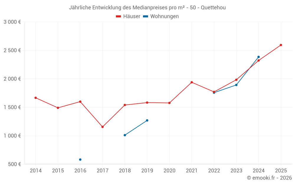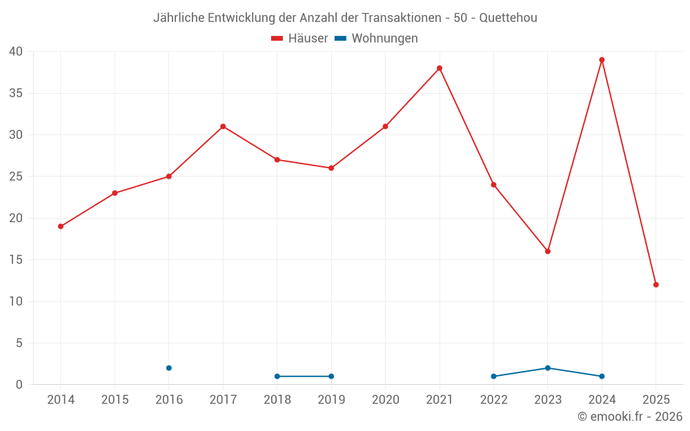 Der Durchschnittspreis auf den 32 Hausgeschäften der letzten 12 Monate in der Gemeinde Quettehou betrug 2 636 € pro Quadratmeter für einen mittleren Immobilienwert von 180 000 €. Über diesen Zeitraum hinweg lagen 60% der Transaktionen zwischen 1 565 und 3 180 € pro Quadratmeter (vom 2. bis zum 8. Dezil).