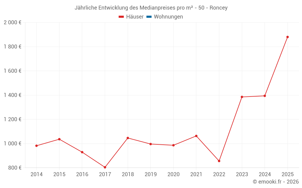 Der Durchschnittspreis auf den 19 Hausgeschäften der letzten 24 Monate in der Gemeinde Roncey betrug 1 463 € pro Quadratmeter für einen mittleren Immobilienwert von 126 100 €. Über diesen Zeitraum hinweg lagen 60% der Transaktionen zwischen 705 und 1 789 € pro Quadratmeter (vom 2. bis zum 8. Dezil).