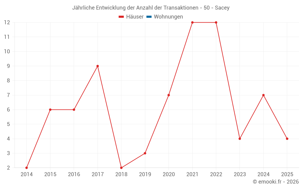 Der Durchschnittspreis auf den 15 Hausgeschäften der letzten 24 Monate in der Gemeinde Sacey betrug 958 € pro Quadratmeter für einen mittleren Immobilienwert von 70 500 €. Über diesen Zeitraum hinweg lagen 60% der Transaktionen zwischen 649 und 1 775 € pro Quadratmeter (vom 2. bis zum 8. Dezil).