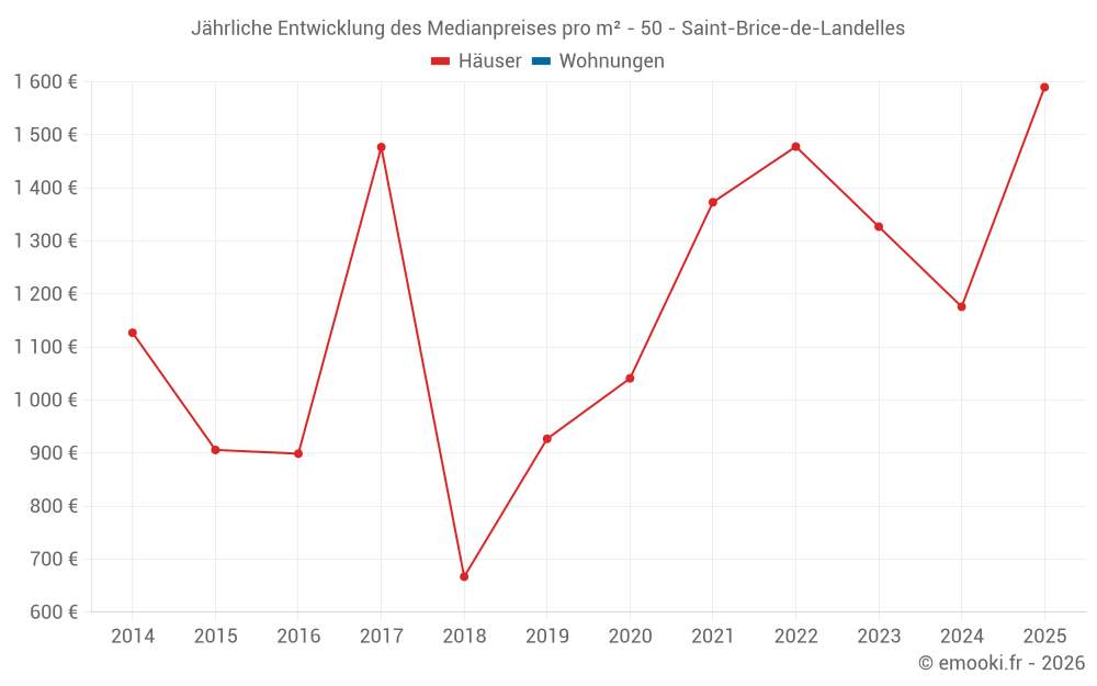 Der Durchschnittspreis auf den 26 Hausgeschäften der letzten 24 Monate in der Gemeinde Saint-Brice-de-Landelles betrug 1 190 € pro Quadratmeter für einen mittleren Immobilienwert von 105 500 €. Über diesen Zeitraum hinweg lagen 60% der Transaktionen zwischen 667 und 1 716 € pro Quadratmeter (vom 2. bis zum 8. Dezil).