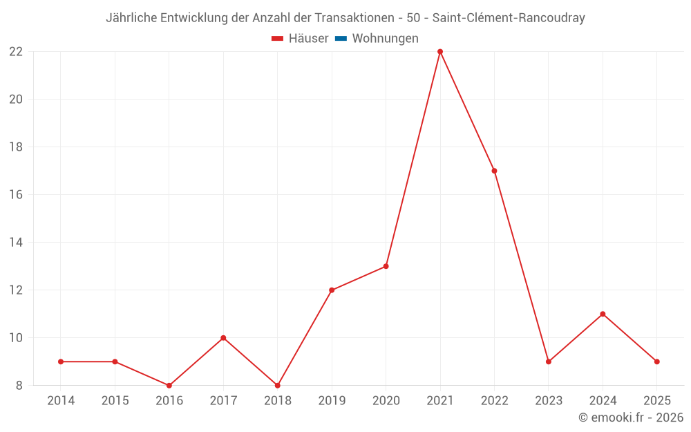 Der Durchschnittspreis auf den 24 Hausgeschäften der letzten 24 Monate in der Gemeinde Saint-Clément-Rancoudray betrug 1 140 € pro Quadratmeter für einen mittleren Immobilienwert von 109 640 €. Über diesen Zeitraum hinweg lagen 60% der Transaktionen zwischen 718 und 1 360 € pro Quadratmeter (vom 2. bis zum 8. Dezil).