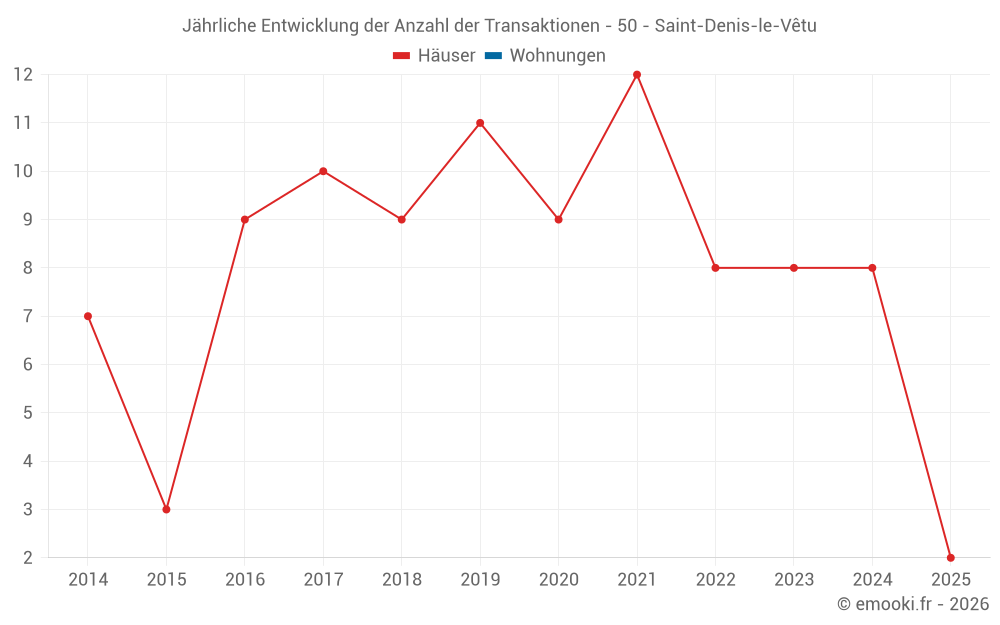 Der Durchschnittspreis auf den 15 Hausgeschäften der letzten 24 Monate in der Gemeinde Saint-Denis-le-Vêtu betrug 1 111 € pro Quadratmeter für einen mittleren Immobilienwert von 140 300 €. Über diesen Zeitraum hinweg lagen 60% der Transaktionen zwischen 1 060 und 1 840 € pro Quadratmeter (vom 2. bis zum 8. Dezil).