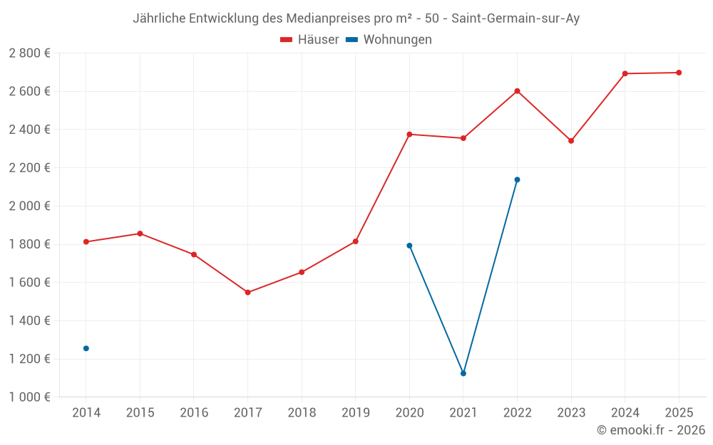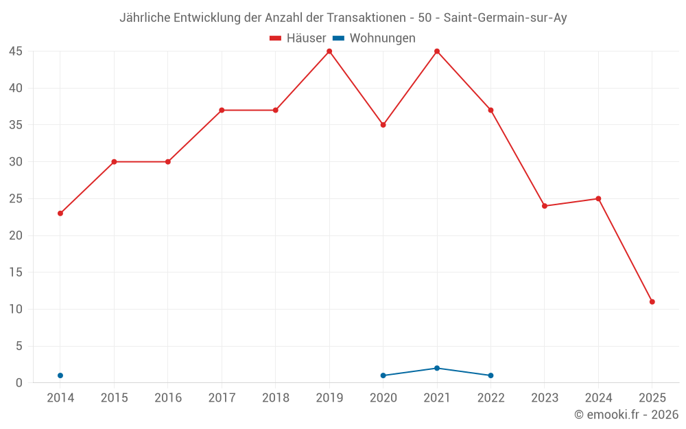 Der Durchschnittspreis auf den 27 Hausgeschäften der letzten 12 Monate in der Gemeinde Saint-Germain-sur-Ay betrug 2 698 € pro Quadratmeter für einen mittleren Immobilienwert von 200 000 €. Über diesen Zeitraum hinweg lagen 60% der Transaktionen zwischen 1 711 und 4 278 € pro Quadratmeter (vom 2. bis zum 8. Dezil).