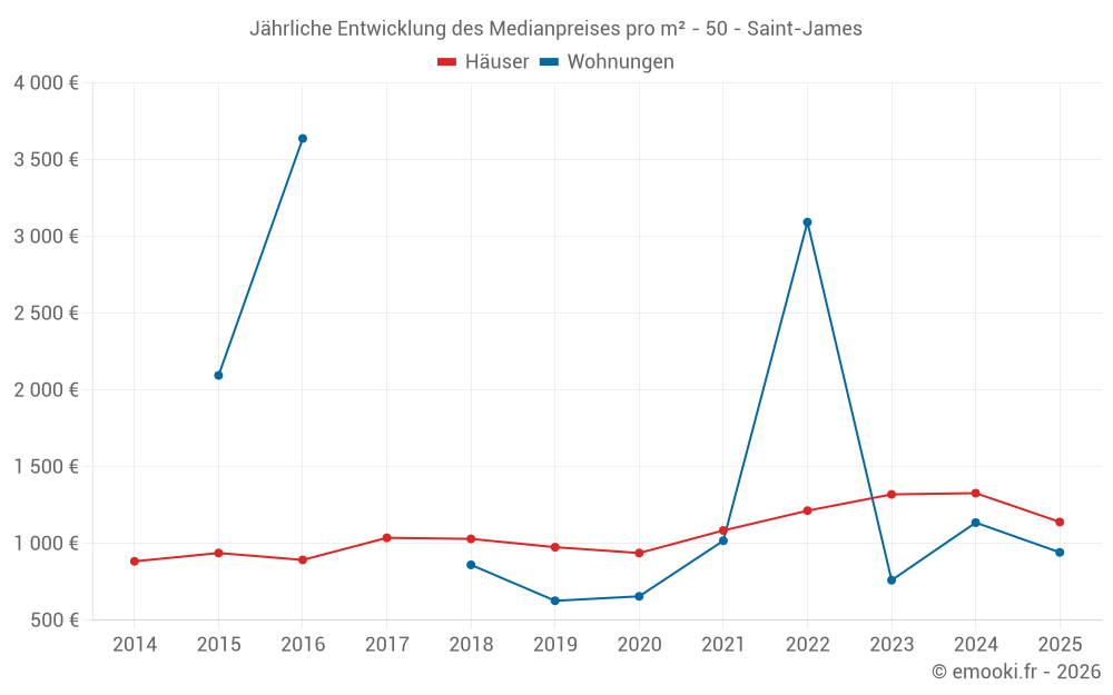 Der Durchschnittspreis auf den 24 Hausgeschäften der letzten 6 Monate in der Gemeinde Saint-James betrug 1 140 € pro Quadratmeter für einen mittleren Immobilienwert von 83 750 €. Über diesen Zeitraum hinweg lagen 60% der Transaktionen zwischen 634 und 1 831 € pro Quadratmeter (vom 2. bis zum 8. Dezil).