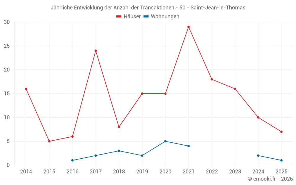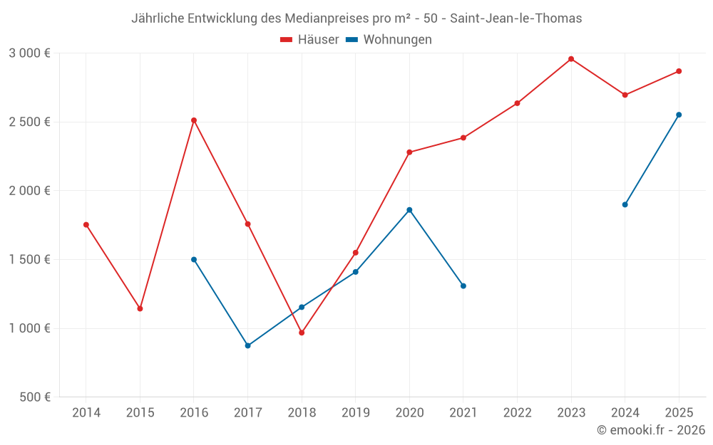 Der Durchschnittspreis auf den 24 Hausgeschäften der letzten 24 Monate in der Gemeinde Saint-Jean-le-Thomas betrug 2 798 € pro Quadratmeter für einen mittleren Immobilienwert von 234 500 €. Über diesen Zeitraum hinweg lagen 60% der Transaktionen zwischen 1 980 und 3 267 € pro Quadratmeter (vom 2. bis zum 8. Dezil).