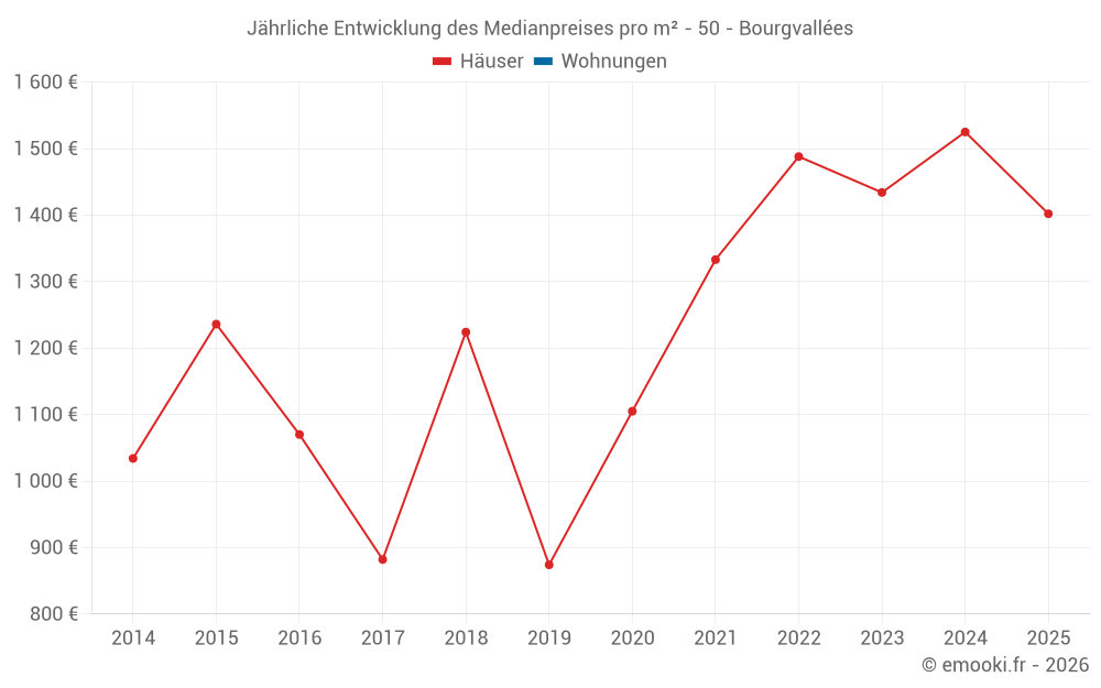 Der Durchschnittspreis auf den 26 Hausgeschäften der letzten 12 Monate in der Gemeinde Bourgvallées betrug 1 572 € pro Quadratmeter für einen mittleren Immobilienwert von 156 500 €. Über diesen Zeitraum hinweg lagen 60% der Transaktionen zwischen 1 190 und 2 063 € pro Quadratmeter (vom 2. bis zum 8. Dezil).