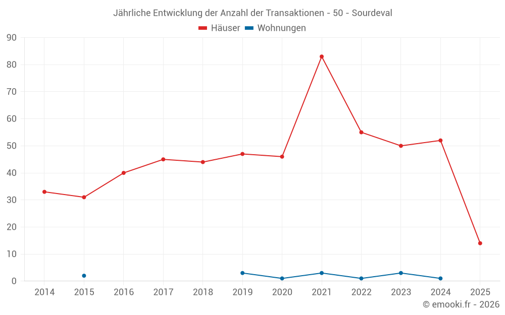 Der Durchschnittspreis auf den 46 Hausgeschäften der letzten 12 Monate in der Gemeinde Sourdeval betrug 1 158 € pro Quadratmeter für einen mittleren Immobilienwert von 101 000 €. Über diesen Zeitraum hinweg lagen 60% der Transaktionen zwischen 594 und 1 930 € pro Quadratmeter (vom 2. bis zum 8. Dezil).
