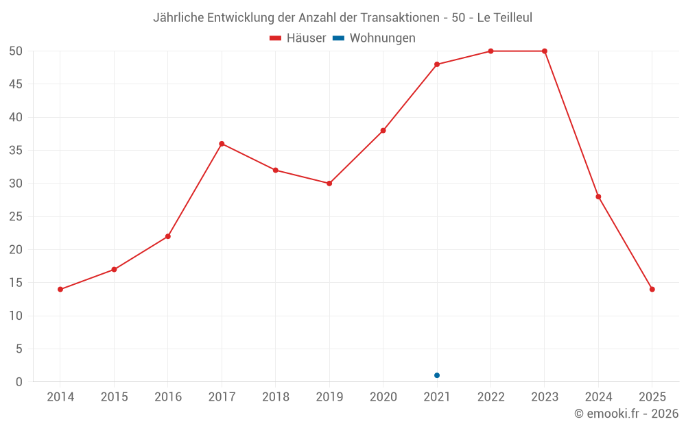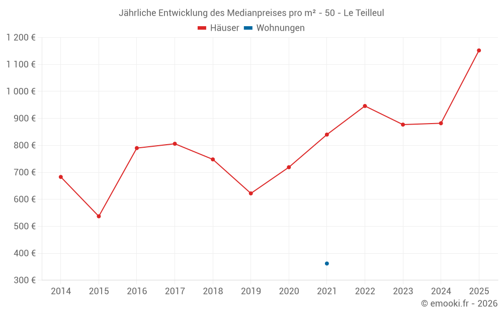 Der Durchschnittspreis auf den 24 Hausgeschäften der letzten 12 Monate in der Gemeinde Le Teilleul betrug 1 080 € pro Quadratmeter für einen mittleren Immobilienwert von 91 100 €. Über diesen Zeitraum hinweg lagen 60% der Transaktionen zwischen 556 und 1 663 € pro Quadratmeter (vom 2. bis zum 8. Dezil).