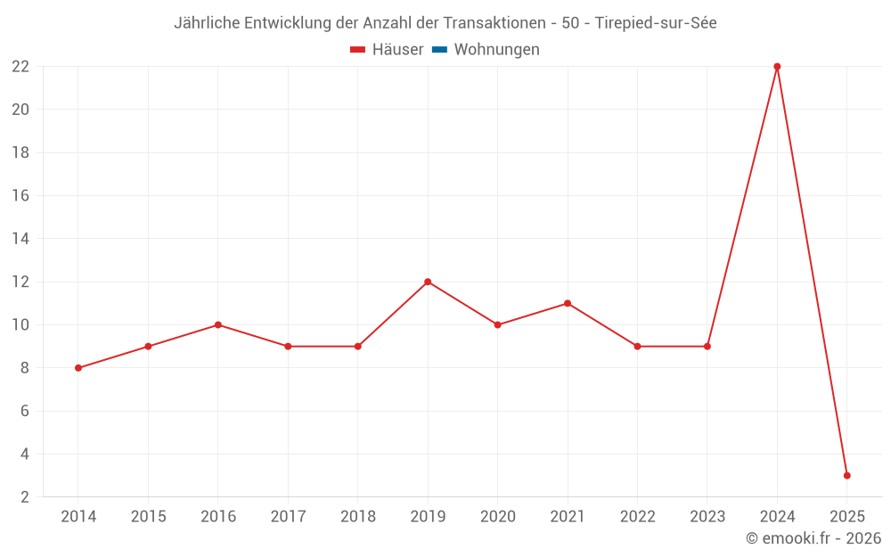 Der Durchschnittspreis auf den 16 Hausgeschäften der letzten 12 Monate in der Gemeinde Tirepied-sur-Sée betrug 1 878 € pro Quadratmeter für einen mittleren Immobilienwert von 157 800 €. Über diesen Zeitraum hinweg lagen 60% der Transaktionen zwischen 1 057 und 2 183 € pro Quadratmeter (vom 2. bis zum 8. Dezil).