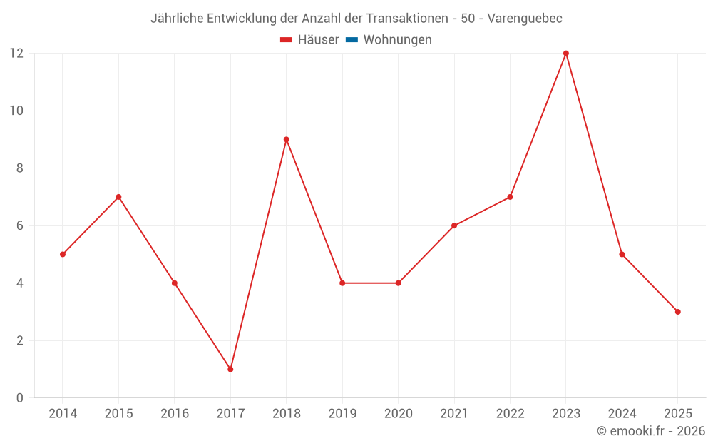 Der Durchschnittspreis auf den 17 Hausgeschäften der letzten 24 Monate in der Gemeinde Varenguebec betrug 1 385 € pro Quadratmeter für einen mittleren Immobilienwert von 155 000 €. Über diesen Zeitraum hinweg lagen 60% der Transaktionen zwischen 945 und 1 990 € pro Quadratmeter (vom 2. bis zum 8. Dezil).