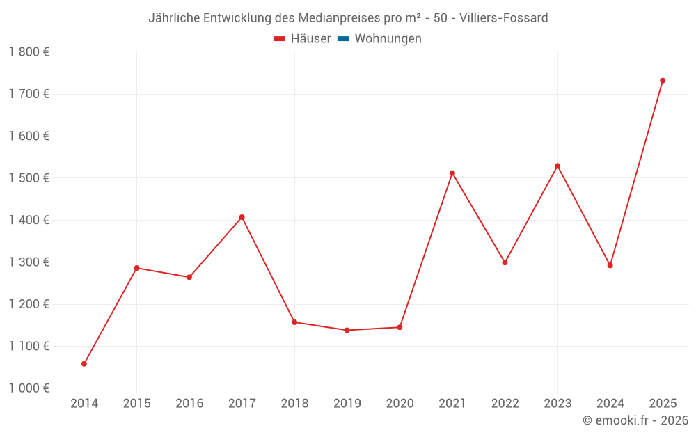 Der Durchschnittspreis auf den 14 Hausgeschäften der letzten 24 Monate in der Gemeinde Villiers-Fossard betrug 1 360 € pro Quadratmeter für einen mittleren Immobilienwert von 158 000 €. Über diesen Zeitraum hinweg lagen 60% der Transaktionen zwischen 1 027 und 1 873 € pro Quadratmeter (vom 2. bis zum 8. Dezil).