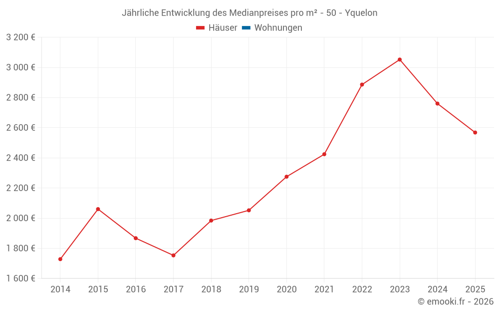 Der Durchschnittspreis auf den 16 Hausgeschäften der letzten 12 Monate in der Gemeinde Yquelon betrug 2 716 € pro Quadratmeter für einen mittleren Immobilienwert von 262 550 €. Über diesen Zeitraum hinweg lagen 60% der Transaktionen zwischen 1 899 und 2 958 € pro Quadratmeter (vom 2. bis zum 8. Dezil).